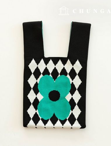 Knit Mini Hand Bag Check Knit Bag Wrist Bag Green Flower