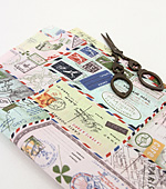 핑크 컬러에 우표 패턴이 프린트 된 면혼방 원단입니다.